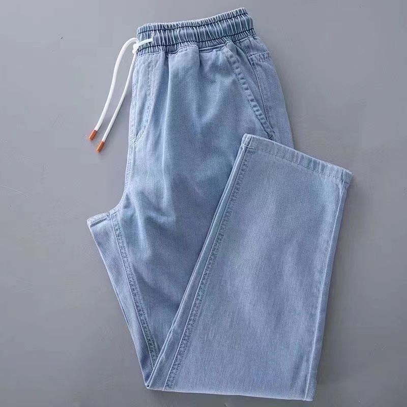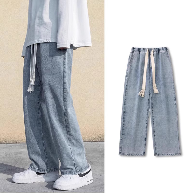 Celana Jeans Kaki Lebar Kasual Lurus Longgar Pinggang Elastis Tali Serut Trendi Model Baru Musim Panas 2025 Pria