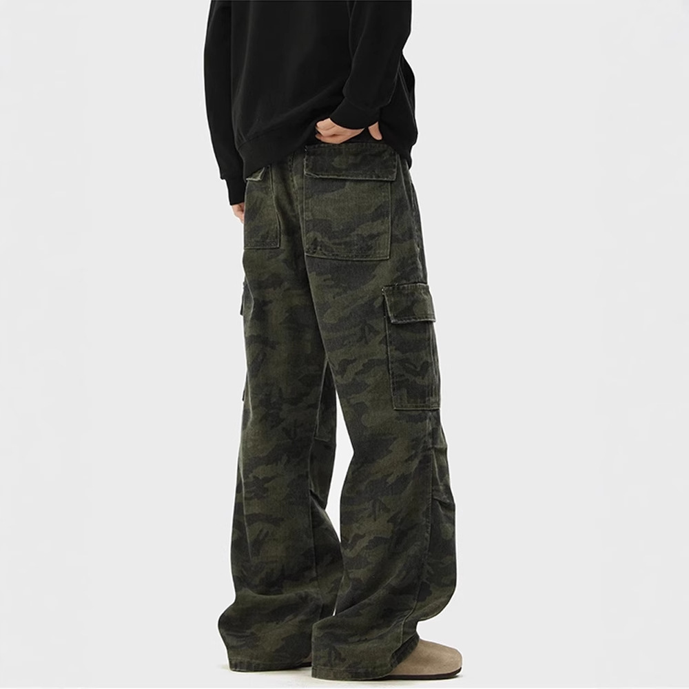 2025 Celana Kamuflase Model Baru Dicuci Air Celana Denim Lurus Longgar Kaki Lebar Gaya Amerika Model Pria