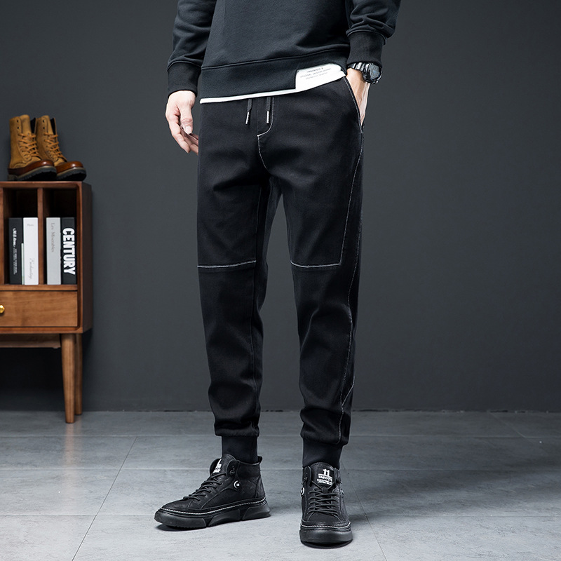 Celana jins longgar bertali untuk pria, celana harem longgar elastis ukuran ekstra besar modis, celana gemuk tali pergelangan kaki