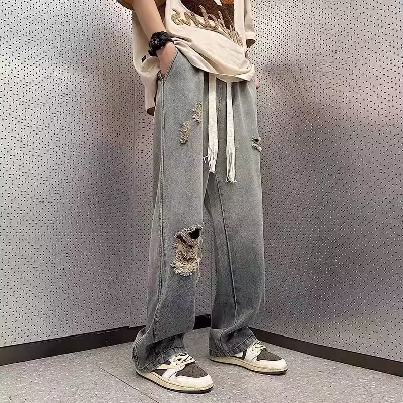 Celana Jeans Lubang Celana Pinggang Elastis Lurus Longgar Model Tipis Musim Panas Pria Celana Kaki Lebar Gaya Tinggi Gaya Amerika Merek Trendi