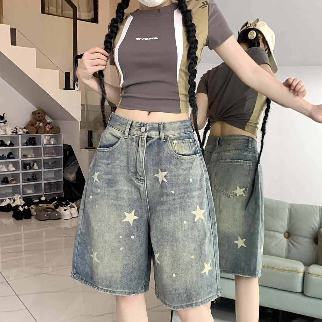 Celana Jeans Kecil Lima Poin Gaya Barat Desain Gaya Barat Lurus Pinggang Tinggi Terlihat Langsing Longgar Motif Cetak Bintang Retro Gaya Amerika