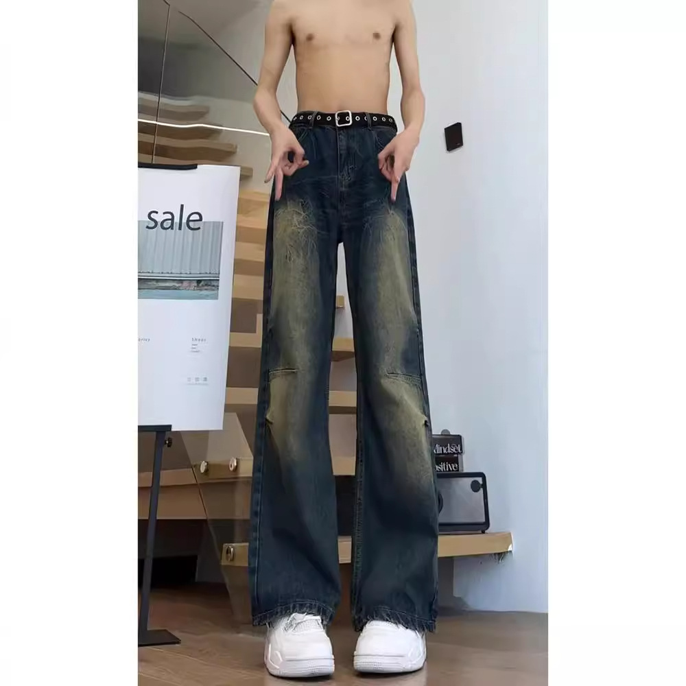 Celana jins pria, musim gugur Eropa dan Amerika, celana jins lumpur kuning retro Amerika, celana panjang berkobar mikro lurus distressed