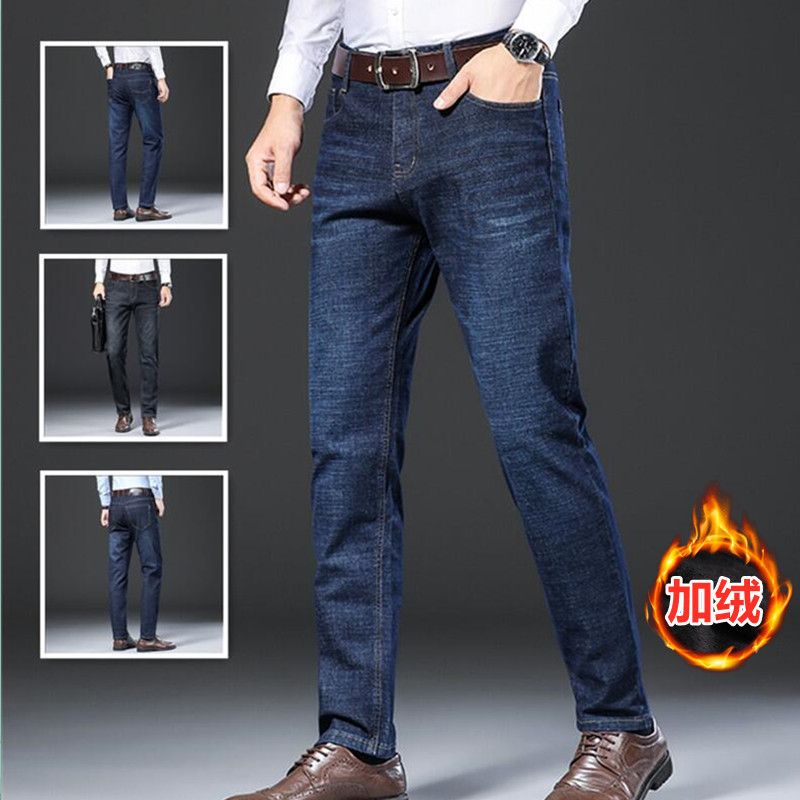 Jins bulu domba lurus pria, celana kasual tebal regang ukuran plus musim gugur dan musim dingin longgar baru