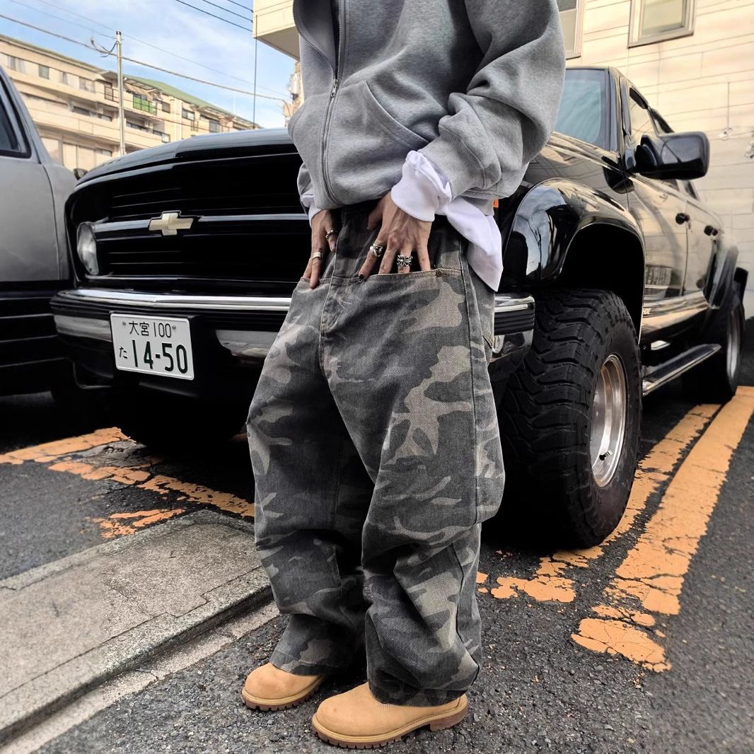 Celana Jeans Kamuflase Kasual Merek Trendi Amerika Celana Panjang Pria Musim Semi dan Musim Gugur Model Baru Longgar Lurus Dicuci