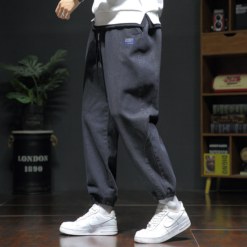 Celana jeans longgar bergaya Korea pria, celana kasual panjang sepergelangan kaki ukuran besar modis