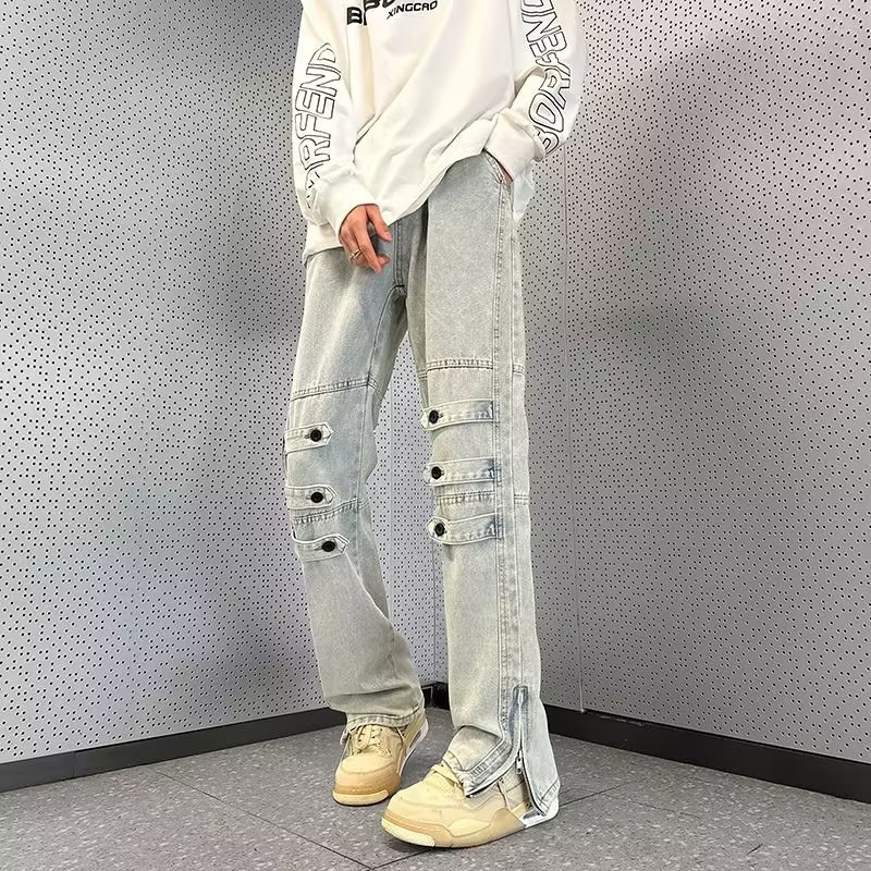 Celana panjang pria musim gugur, jeans desain kancing dipersonalisasi, celana panjang trendi, celana panjang lurus longgar ritsleting
