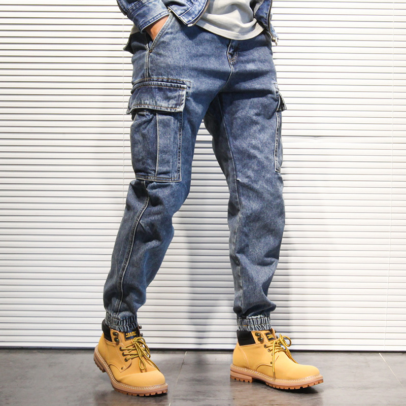 Celana kargo denim retro Amerika untuk pria, celana jogger longgar bergaya vintage dengan pencucian berat untuk pria.