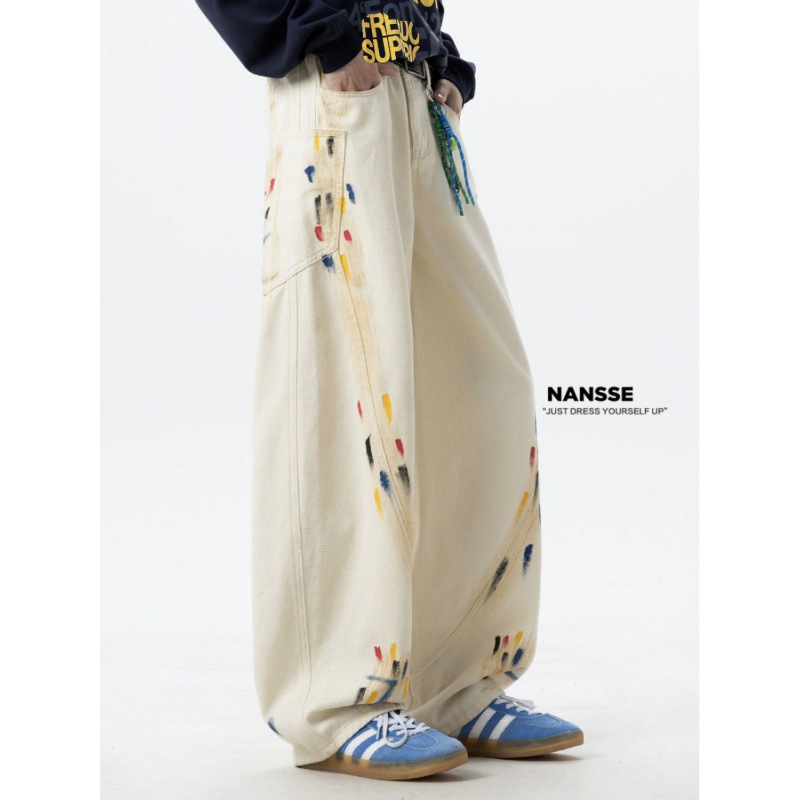 Celana Jeans Kaki Lebar Grafiti Tinta Celana Kasual Lurus Longgar Tampan Cuci Air Gaya Amerika Model Baru Musim Panas 2025 Pria