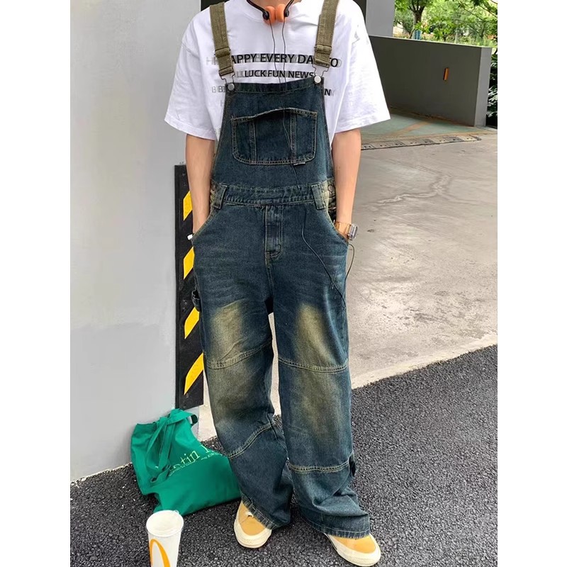 Celana Jeans Pria Bertali Retro Gaya Amerika Celana Sambung Sambungan Lurus Longgar Dicuci Air Tua Merek Trendi