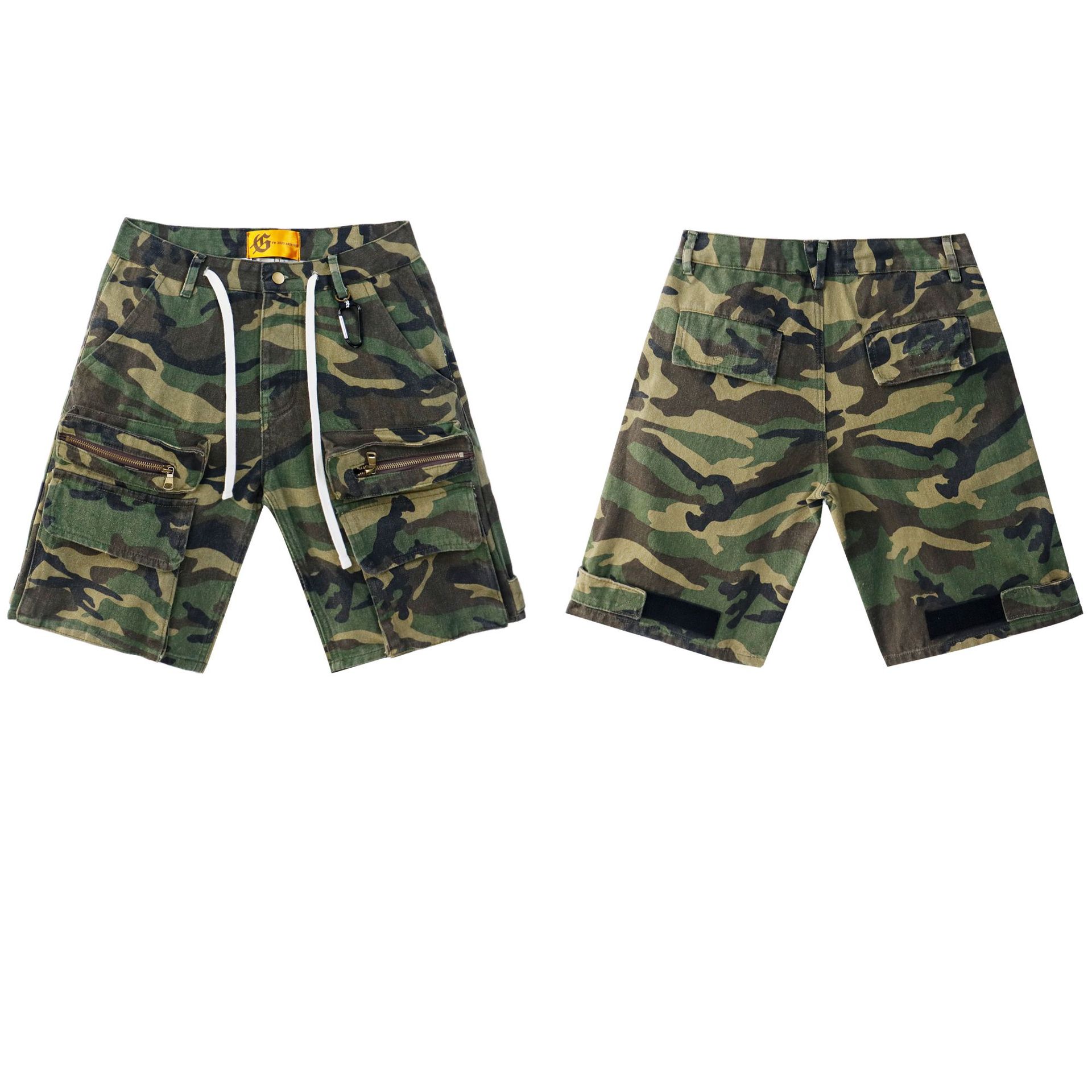 Musim Panas 2025 Model Baru GOD Hijau Tentara Kamuflase Celana Pendek Denim Model Sama Pria dan Wanita