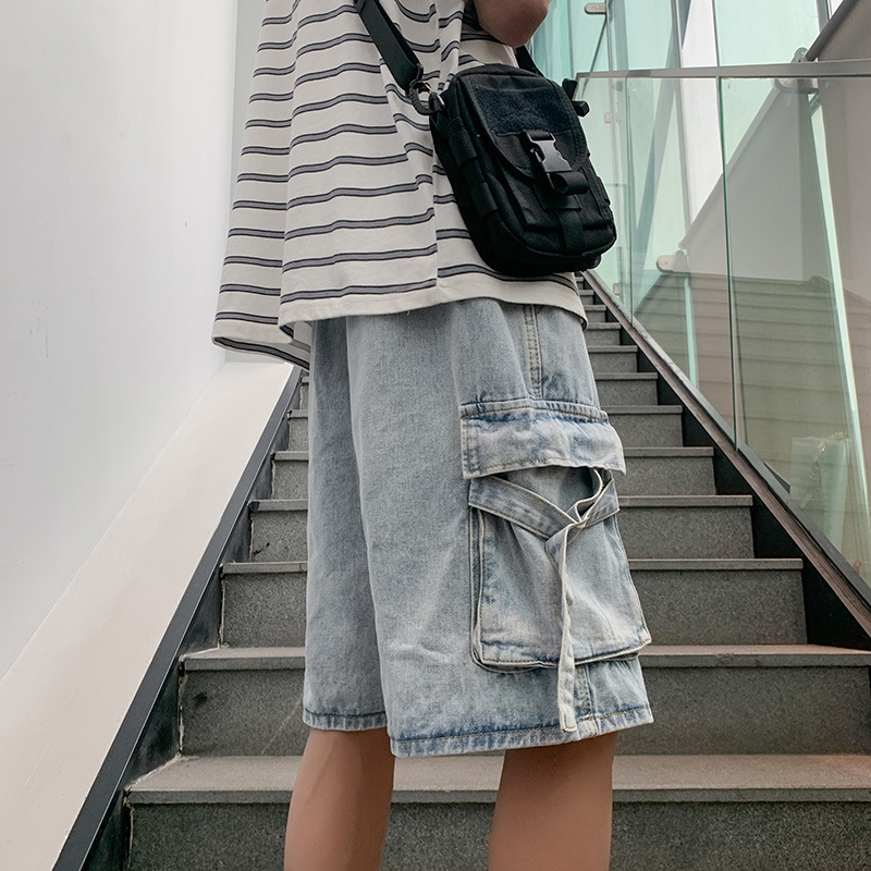 Celana pendek Denim retro Amerika celana pendek ins merek fashion tipis musim panas pria celana pendek lurus Jepang oversiz