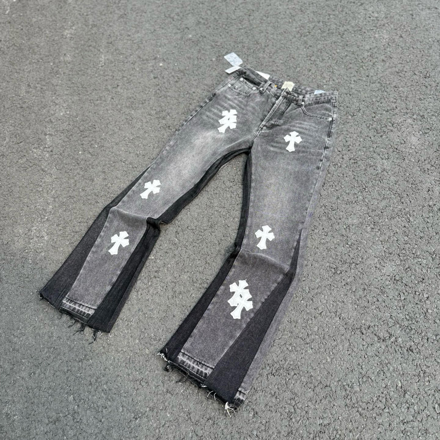 Jeans Jeans Chrome Hearts CH Crooked Terompet yang Dicuci Air Longgar dengan Silang Pola Salju Hitam Abu-abu