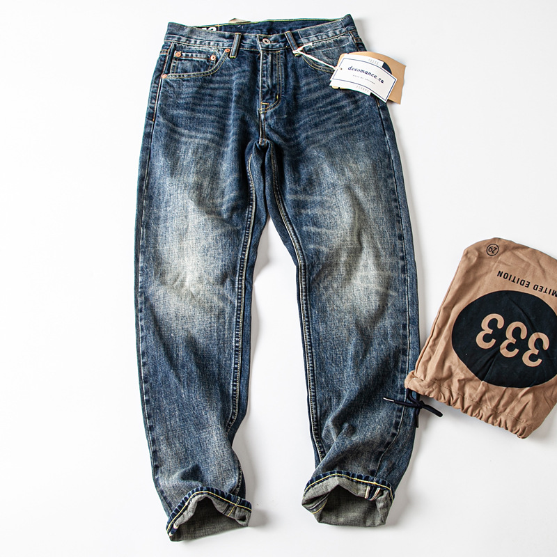 Jeans denim selvedge berwarna biru vintage dengan efek cuci retro Jepang untuk pria, celana panjang lurus longgar bergaya Amerika.