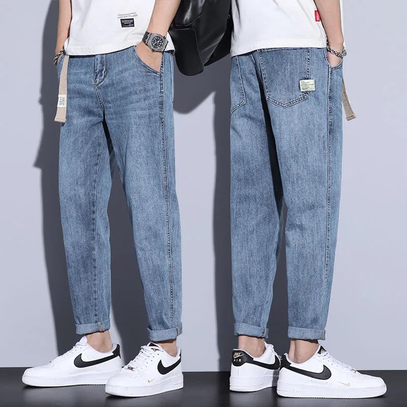 Celana panjang hip hop pria, celana harem kurus pemuda, celana ketat bergaya Korea, celana jins pria