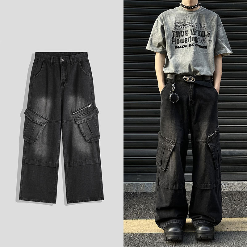 Celana Jeans Kerja Banyak Saku Ritsleting Retro Gaya Amerika Celana Panjang Kaki Lebar Hip Hop Longgar Merek Trendi Musim Semi Musim Gugur Pria