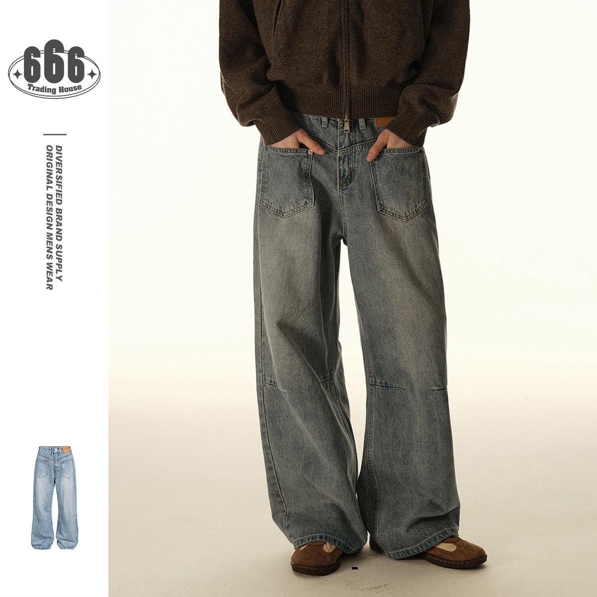 Pakaian Pria MRA Celana Jeans Retro Dicuci Denin Longgar Lurus Celana Kaki Lebar Kasual Celana Panjang Pria Musim Semi