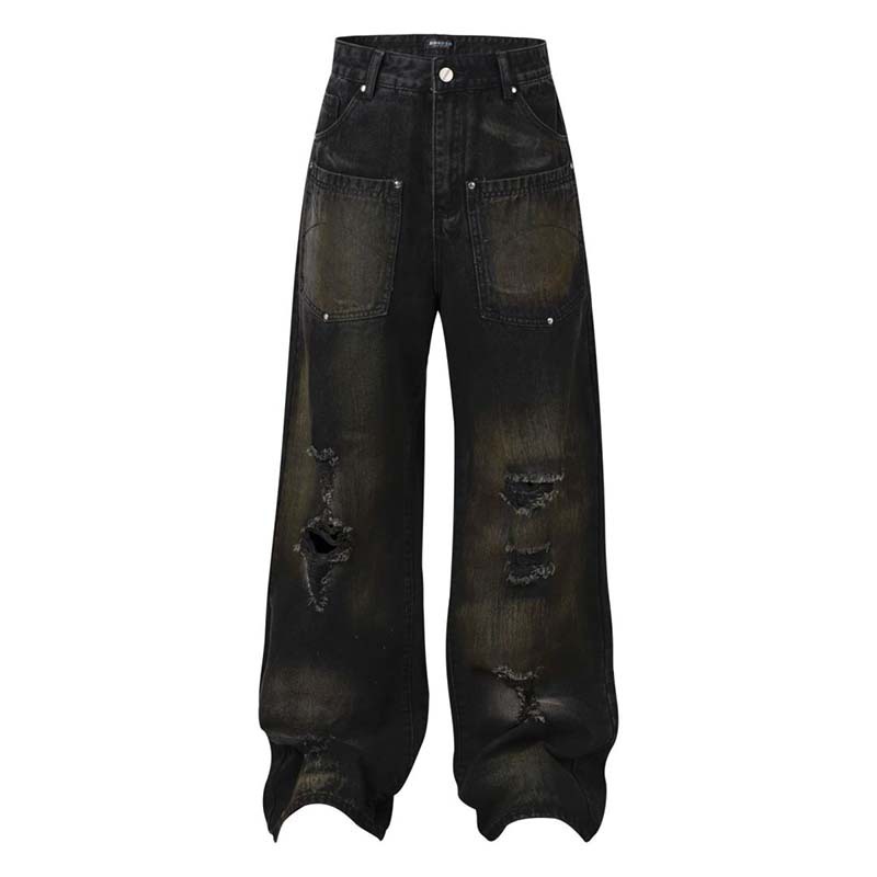 Celana Lurus Longgar Retro Jalan Tinggi Model Pria Celana Jeans Lurus Kotor Terpotong Pinggir Bulu
