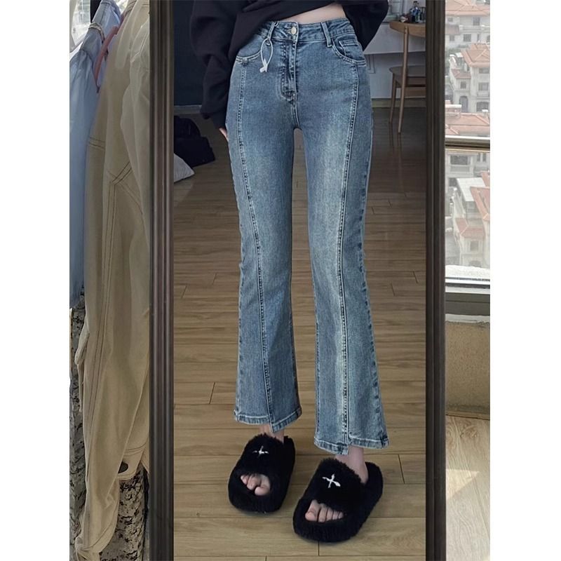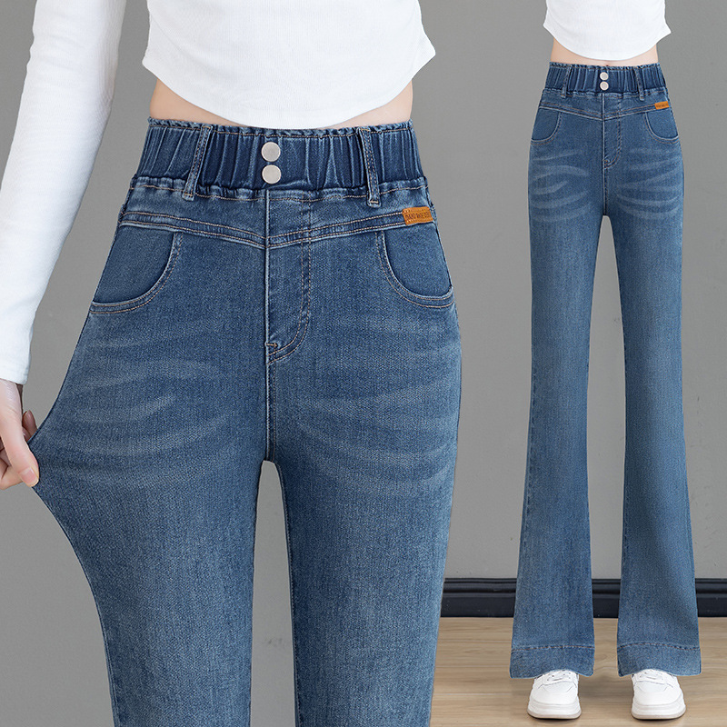 Celana Panjang Pinggang Elastis Celana Jeans Ukuran Besar Musim Gugur Pakaian Musim Dingin 2025 Celana Terompet Tapal Kuda Terlihat Langsing Pinggang Tinggi Wanita