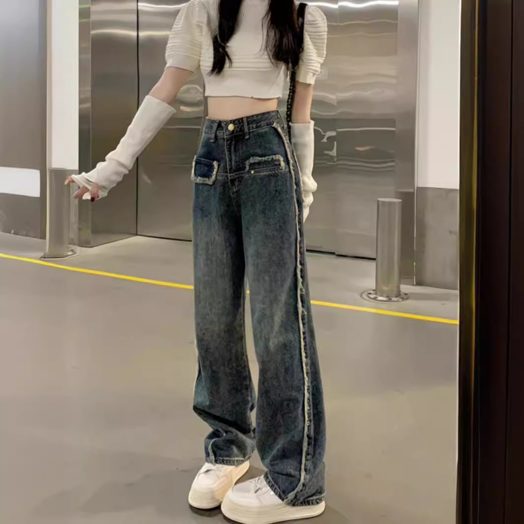 2024 musim semi dan musim gugur baru lurus retro pelangsing ukuran besar saudara perempuan gemuk kaki lebar kain pel celana jeans pinggang tinggi untuk wanita