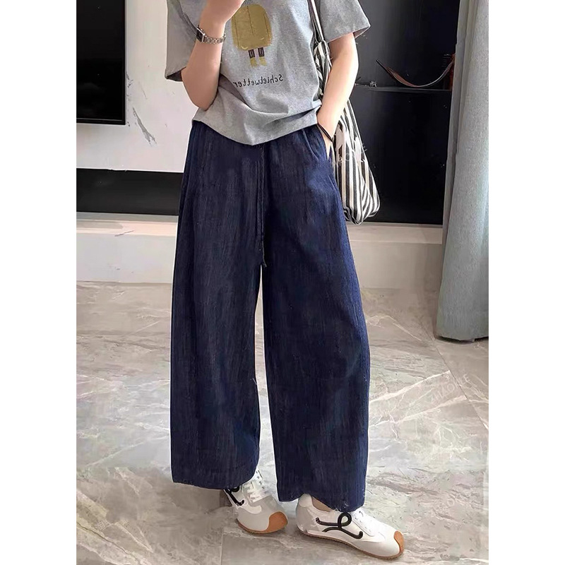 Celana Jeans Warna Biru Tua Retro Ukuran Besar Celana Panjang Kaki Lebar Lurus Terlihat Ramping Pinggang Tinggi Longgar Gadis Gemuk Model Tipis Musim Panas Wanita