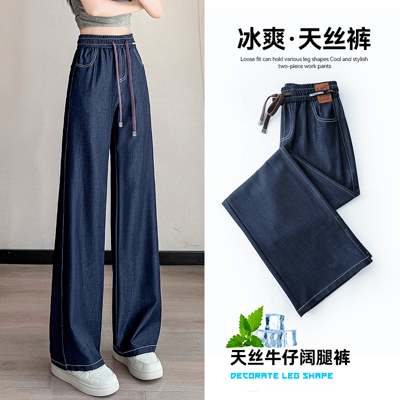 Celana Jeans Sutra Kaki Lebar Versi Sempit Celana Lurus Sutra Es Terlihat Kurus Longgar Pinggang Tinggi Ukuran Besar Model Tipis Musim Panas Tahun 2025 Wanita