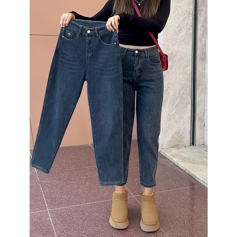 Celana jeans wanita, celana pensil ukuran plus, gadis gemuk, pinggang elastis, semua cocok, jeans tebal, bulu domba, musim dingin 2023