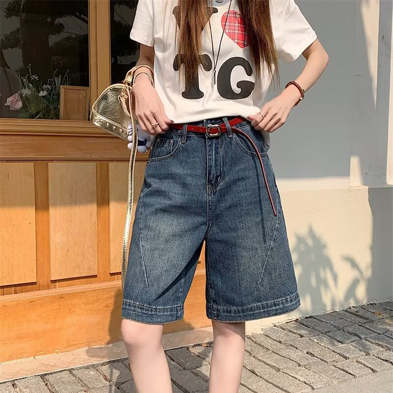 Celana Pendek Denim Huruf A Gaya Amerika Retro Ukuran Besar Celana Setengah Kaki Lebar Lurus Terlihat Ramping Pinggang Tinggi Wanita Gemuk Musim Panas