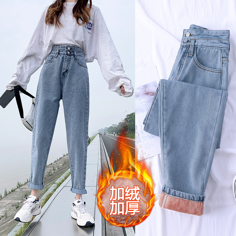 Celana jeans tebal wanita, celana jins pinggang tinggi longgar lurus, ukuran besar pakaian luar harem daddy musim gugur dan musim dingin
