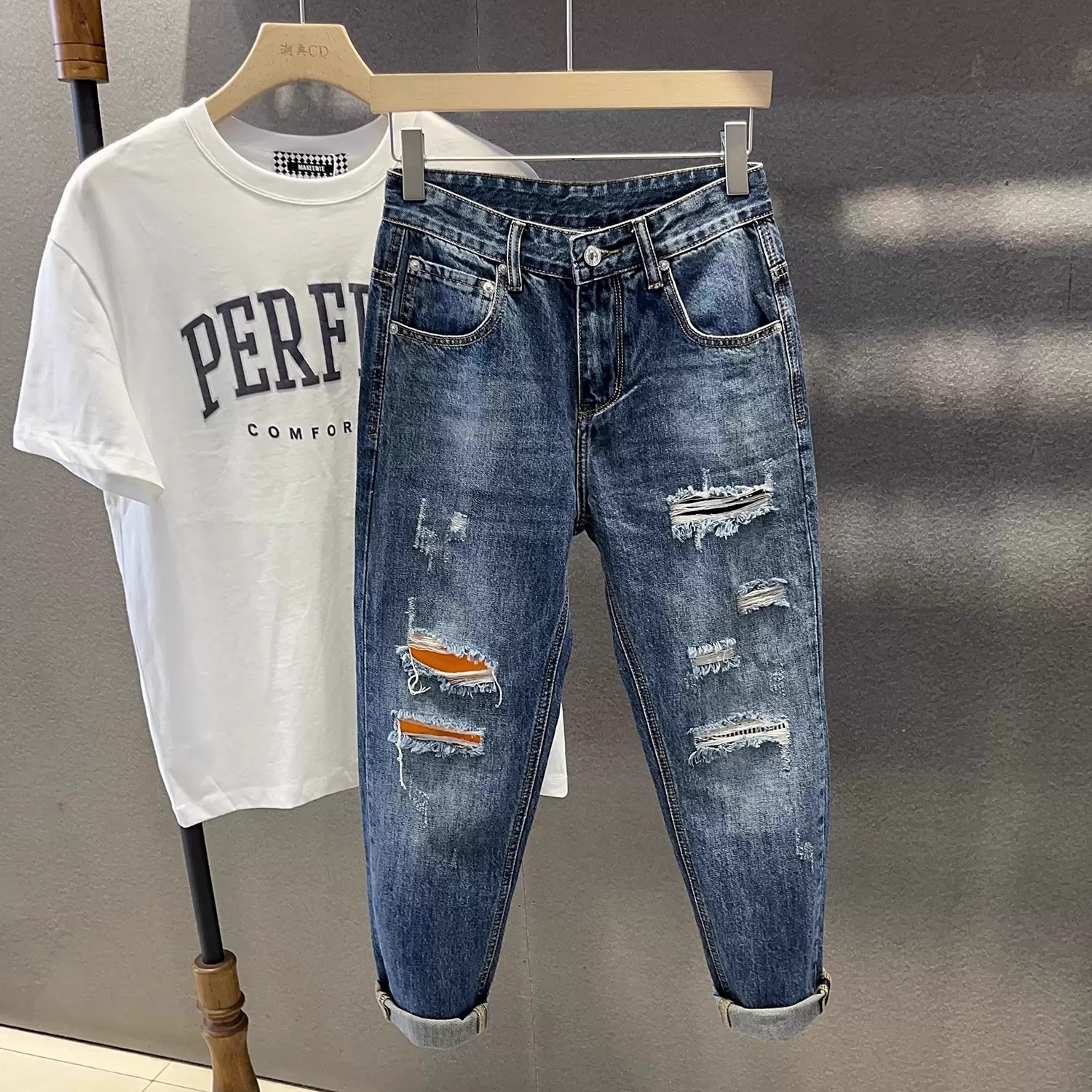 Celana jins ketat pria, celana jins ketat pria, celana pria trendi, celana pengemis, celana pria musim semi dan musim gugur
