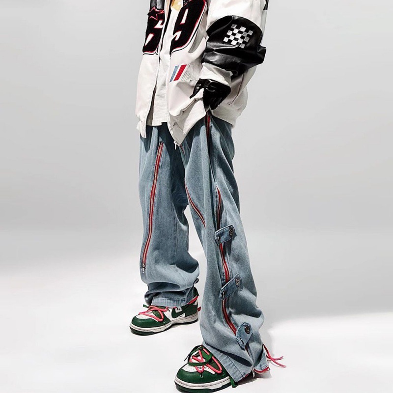 Celana panjang hip hop pria dan wanita, jeans lurus longgar ukuran besar split ritsleting Amerika bermerek fashion Korea 2023