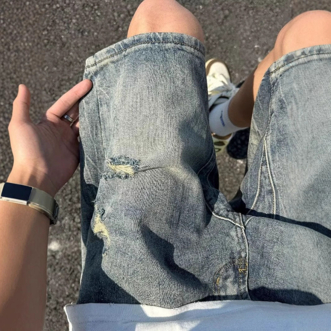 Celana Pendek Denim Berlubang Celana Retro Gaya Amerika Model Baru 2025 Model Tipis Musim Panas Pria Celana Setengah Perempat Ukuran Besar Merek Trendi Longgar