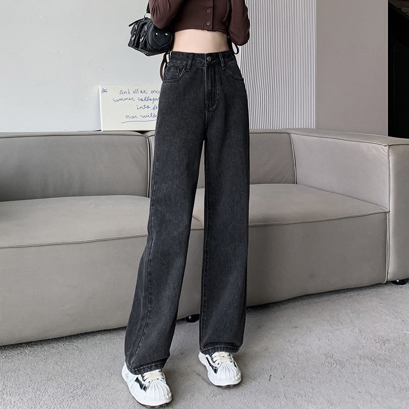 Celana Jeans Kaki Lebar Pinggang Tinggi Wanita Model Baru Musim Gugur Musim Dingin Ukuran Besar Instagram Longgar Hitam Abu-abu Jatuh Terlihat Langsing Celana Lurus
