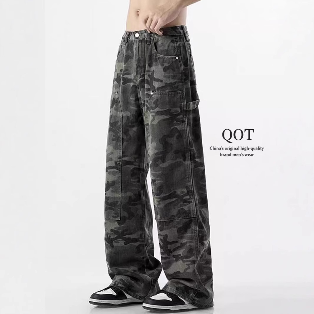 Celana Jeans Pakaian Kerja Kamuflase Gaya Amerika Celana Lurus Hiphop Jalanan Tinggi Longgar Pria Celana Panjang Olahraga Kaki Lebar Ukuran Besar Merek Trendi