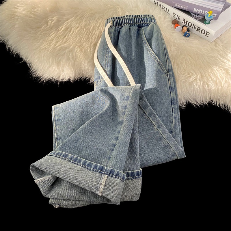 Jeans elastis lurus pria, celana jins longgar bf tipis pemuda retro distressed kaki lebar tali serut dicuci