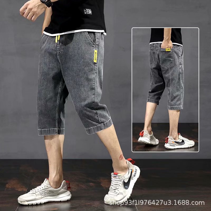 Celana Pendek Denim Mikro-elastis 7/10 Celana Panjang 7/8 Kaki Lebar Longgar Pinggang Elastis Trendi untuk Pria Celana Sedang di Bawah Lutut Kasual Pria