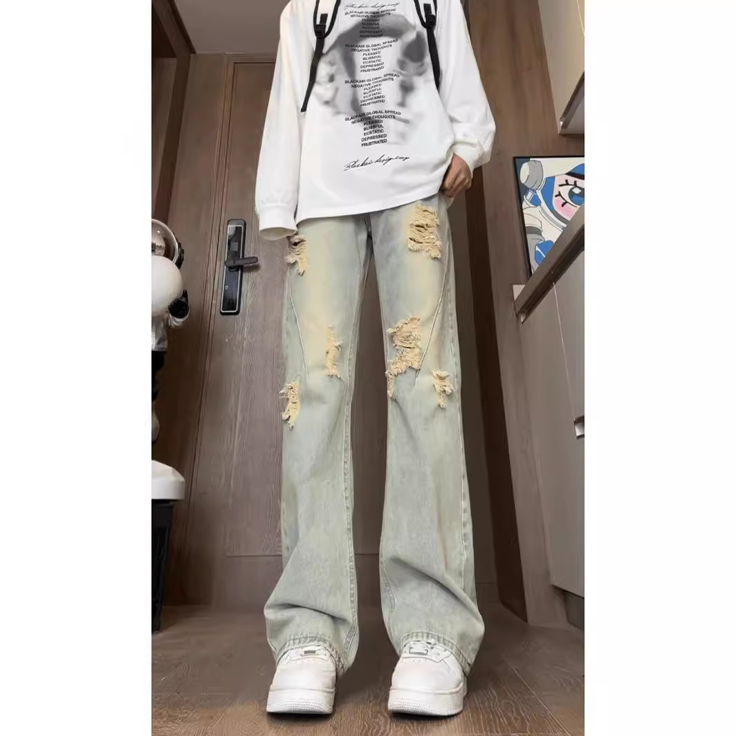 Celana jins robek jalanan goreng berat perdagangan luar negeri pria gaya Eropa dan Amerika celana ramping erosi lurus Amerika daftar perdagangan luar negeri