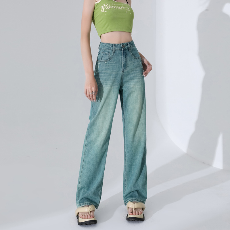 Celana Jeans Dicuci Air Retak Khusus untuk Perdagangan Luar Negeri Celana vibe Jalan Tinggi Retro Gaya Amerika Celana Lurus Pinggang Sedang Longgar