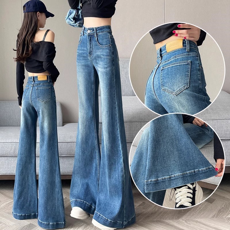 Celana Jeans Wanita Kecil Retro Ukuran Besar Celana Terompet Menutupi Daging Longgar Jalan Tinggi Terlihat Ramping Pinggang Tinggi Model Baru Mudah Dipadu Padan Trendi