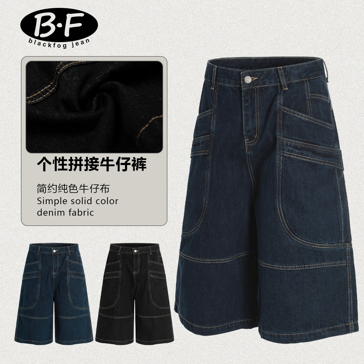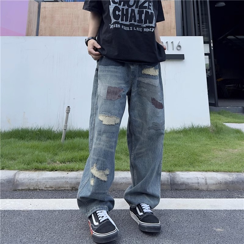 Celana jins musim panas untuk pria, celana jins jalanan, celana lurus tambalan bermerek, celana pel kaki lebar ukuran plus, celana panjang hip hop Amerika, celana lurus untuk pria