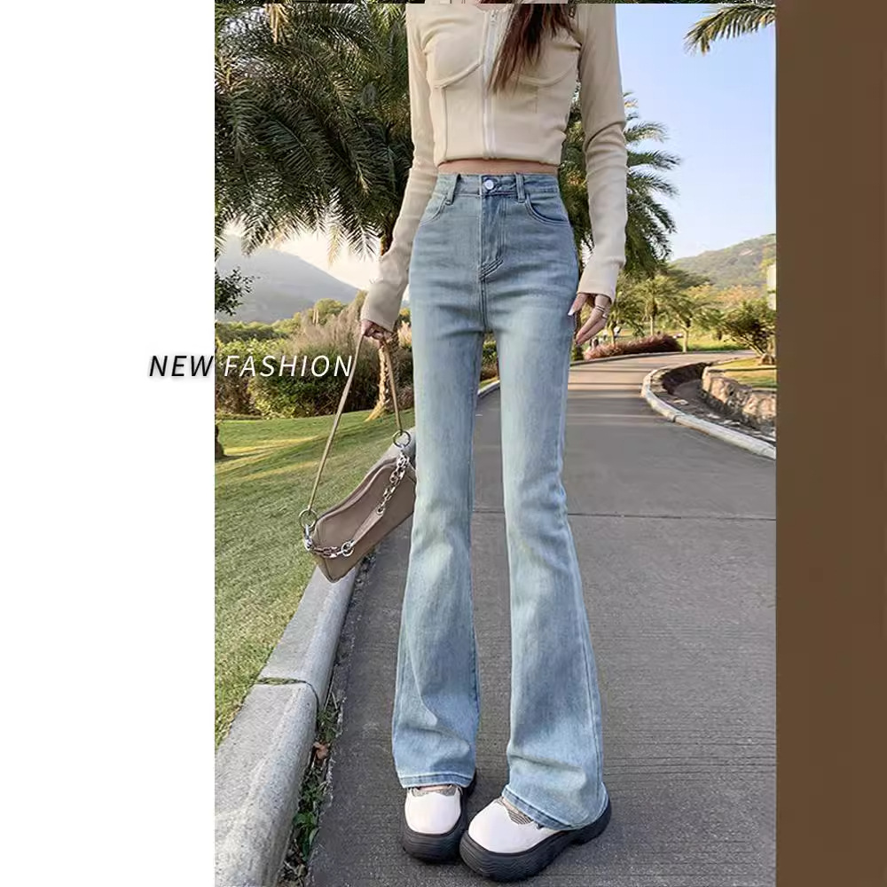 Micro flared jeans wanita pinggang tinggi, celana pel longgar lurus ramping meregang ketat musim semi dan musim gugur 2024