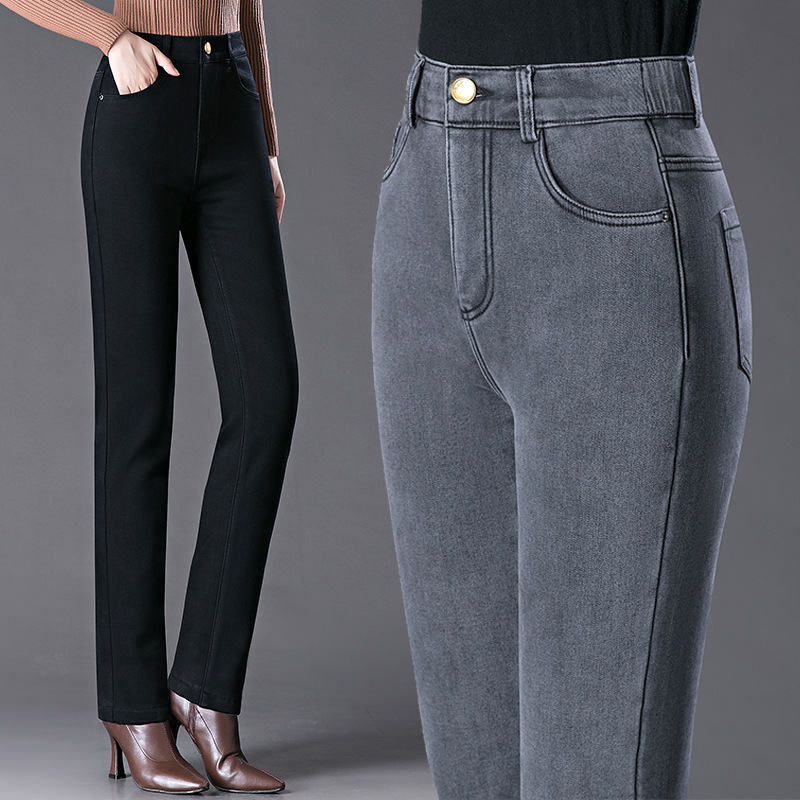 Celana panjang jins ramping wanita, celana jins warna abu-abu, celana panjang kasual elastis ukuran plus sederhana dan musim semi untuk wanita