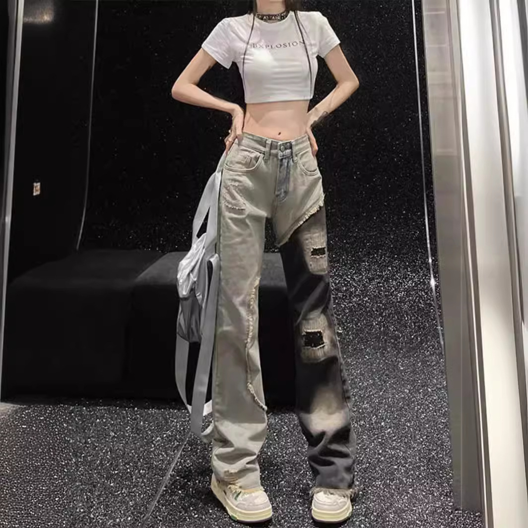 Celana kaki lebar retro robek, jeans kasual longgar pelangsing, celana lurus Amerika baru 2024