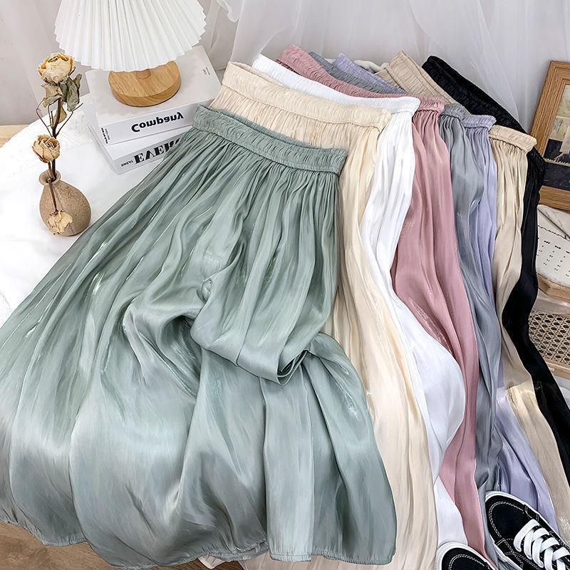 Rok sifon benang mutiara untuk wanita, Rok midi berlipat a-line ramping pinggang tinggi musim panas ukuran besar