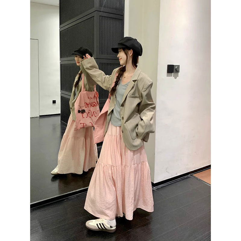 Rok pinggang tinggi jahitan merah muda untuk wanita, rok peri ramping longgar musim semi baru 2024, rok panjang serbaguna