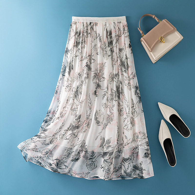 Tersedia-rok tipis sutra ukuran besar menggantung menggantung bernapas dicetak pelangsing elegan sutra murbei menyegarkan musim panas