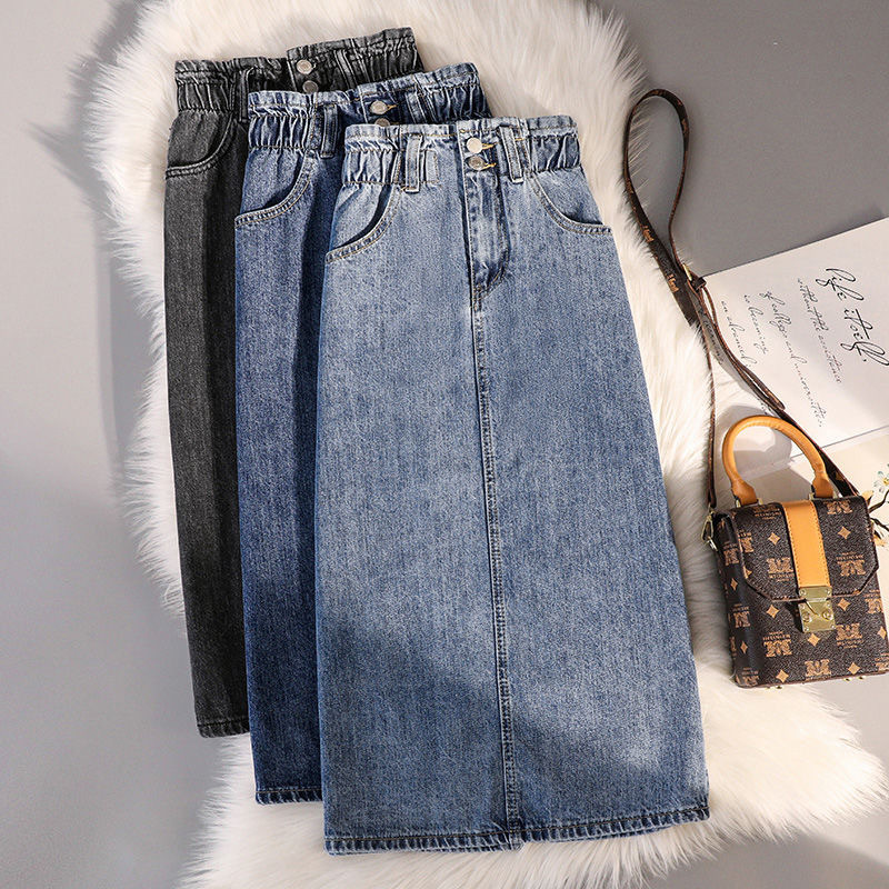 [1250] Rok Denim Belahan Ukuran Besar Kelas Atas Wanita Gemuk Wanita Pinggang Tinggi Elit Ketat Di Atas Lutut Pria Kecil Model Panjang Sedang