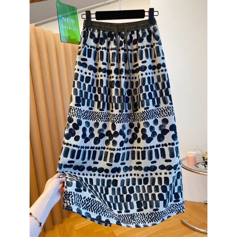 Lintas batas 2024 musim semi dan musim panas baru gaya retro artistik longgar pinggang elastis warna yang cocok katun dan rok linen rok pelangsing a-line