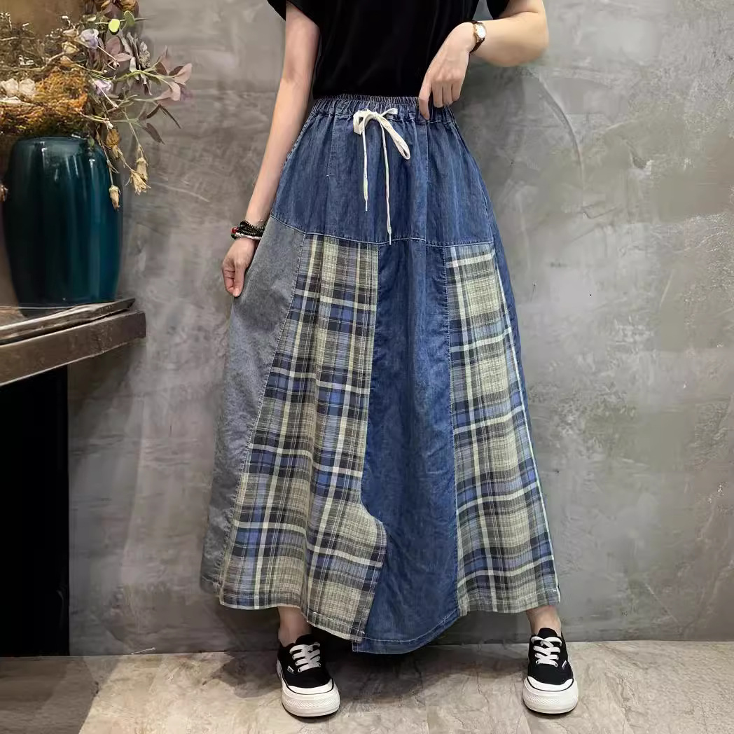 Rok Denim wanita, pribadi, warna kontras, rok Denim jahitan kotak-kotak, ukuran besar, pelangsing longgar, gaya Barat, rok ayun besar tidak beraturan