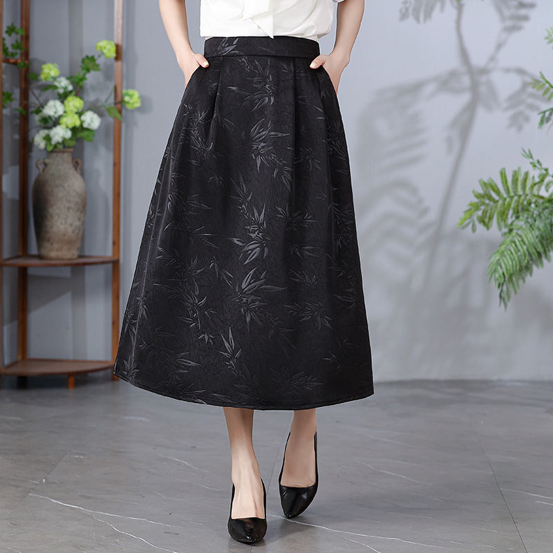 Pakaian Musim Panas Ibu Gaya Tiongkok Baru Rok Setengah Badan Jacquard Sutra Imitasi Kasa Aroma Rok A-Line Sutra Satin Rok Wanita Ukuran Besar