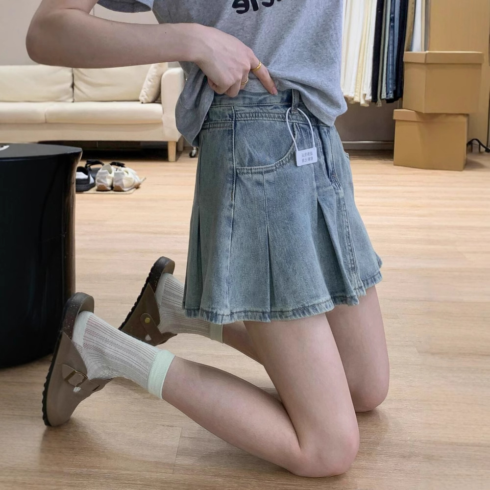 Rok Pendek Denim Lipit Warna Muda Rok Setengah Badan Bentuk Pir Terlihat Langsing Pinggang Tinggi Ukuran Besar Wanita Gemuk Model Baru Musim Panas Wanita